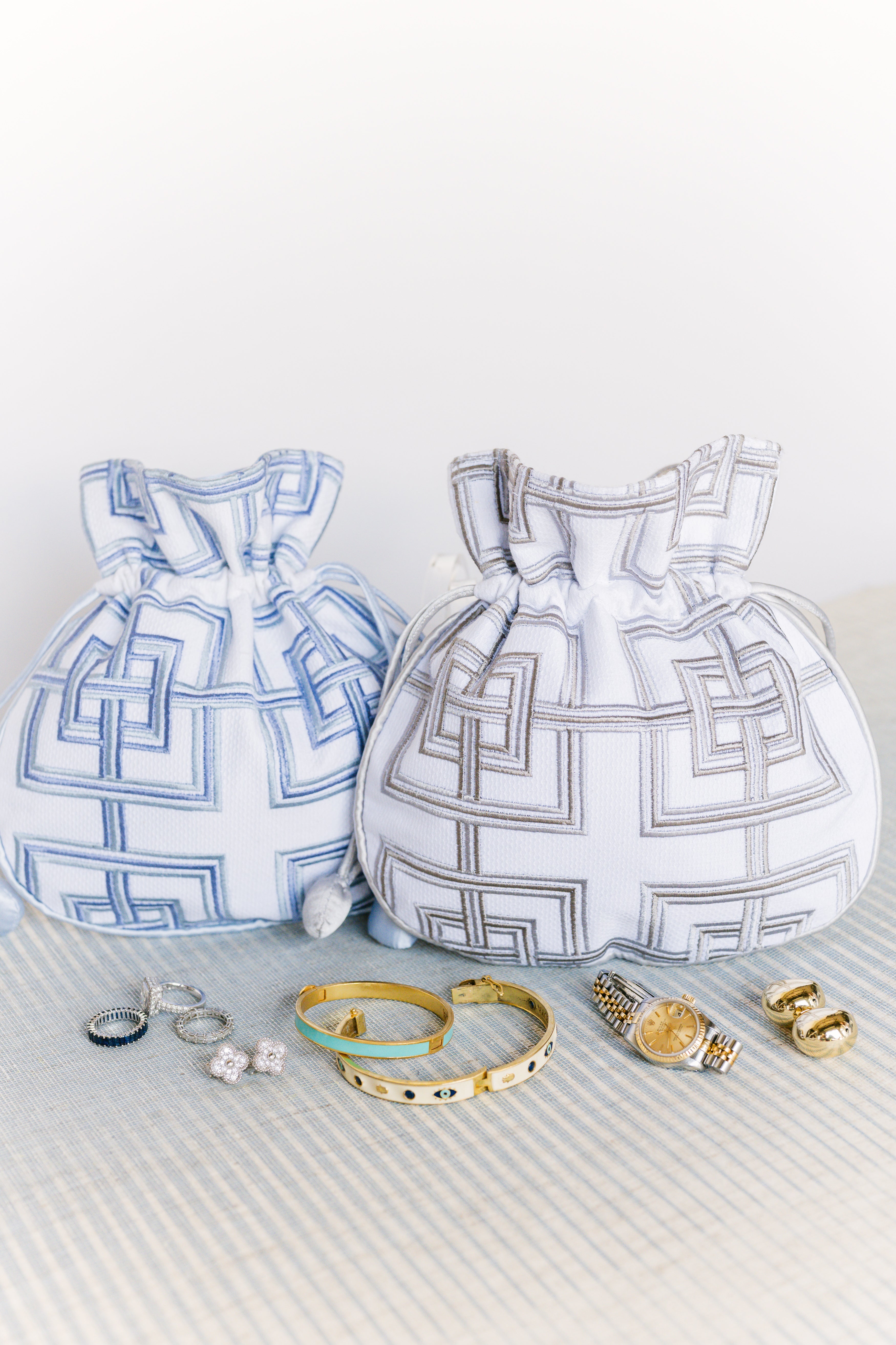 Keep your smallest, most valuable jewelry safe with this stylish embroidered drawstring pouch. Crafted from treated pique fabric with a bold geometric design, this pouch is satin-lined for an added touch of luxury. The drawstring closure ensures secure storage, making it an essential travel accessory.