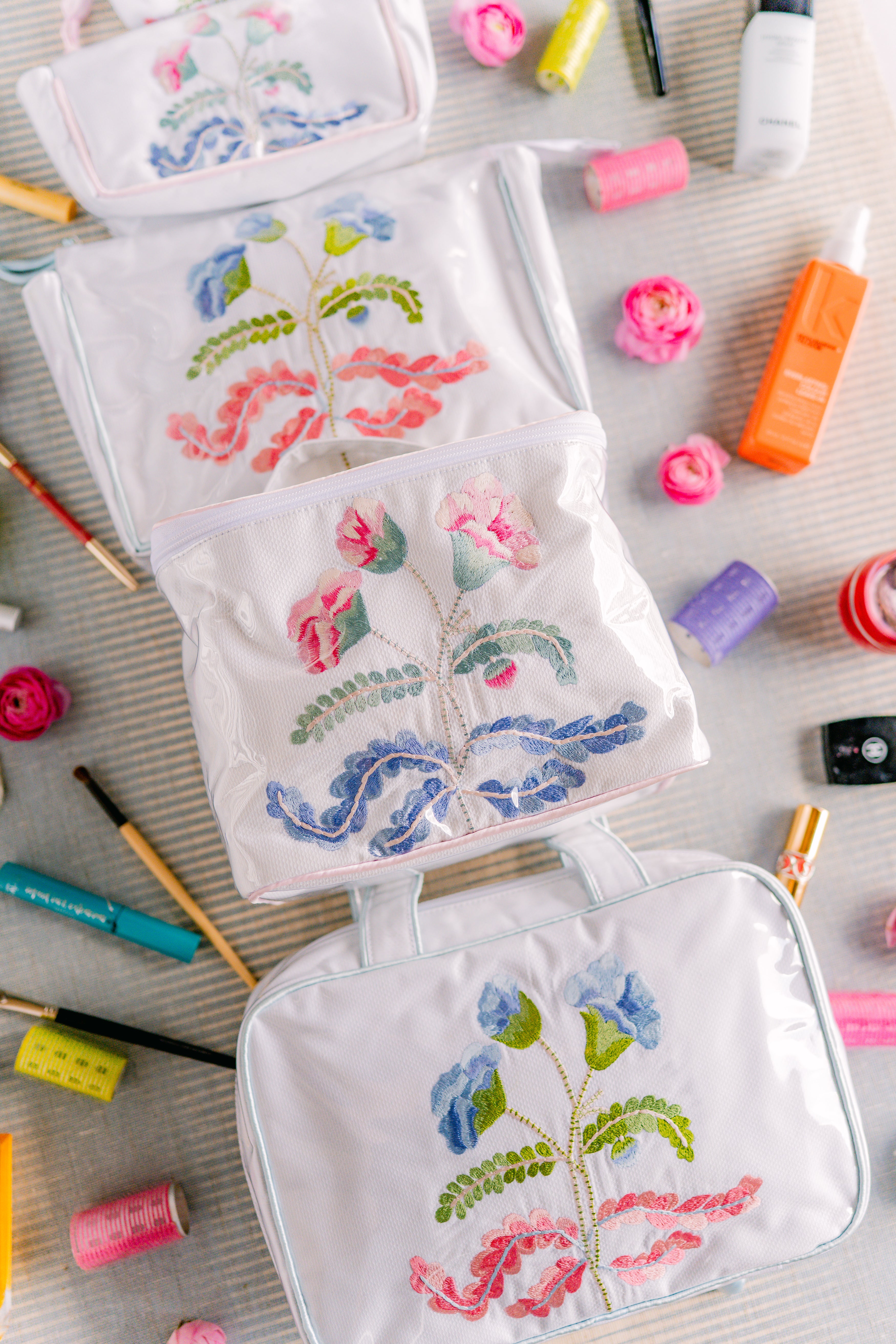 Designed for effortless beauty organization, the Embroidered Train Case features delicate carnation embroidery on treated pique fabric, covered with a clear protective plastic for easy cleaning. The six-compartment divider keeps your essentials neatly arranged, while the zipper enclosure ensures everything stays secure.