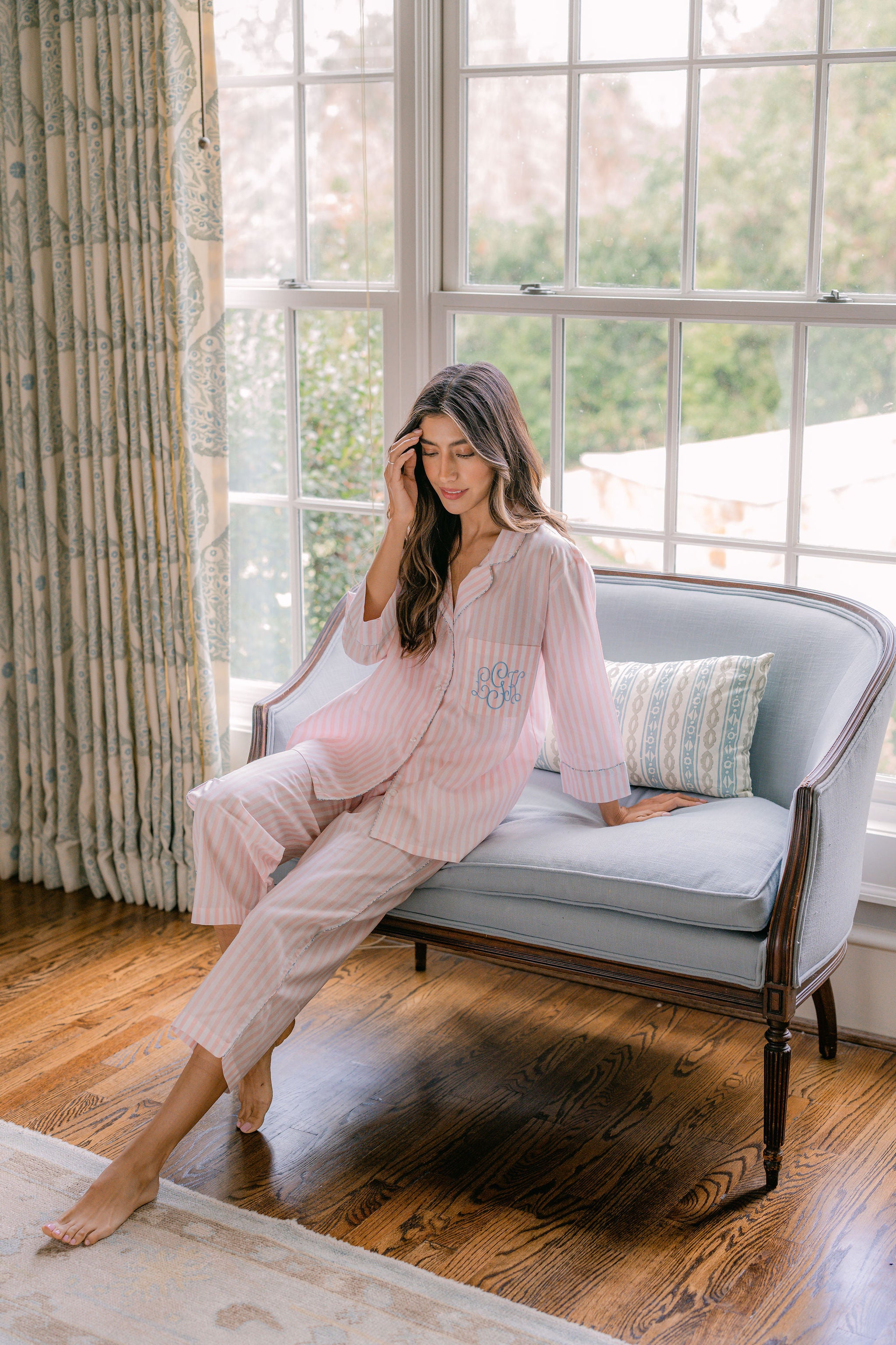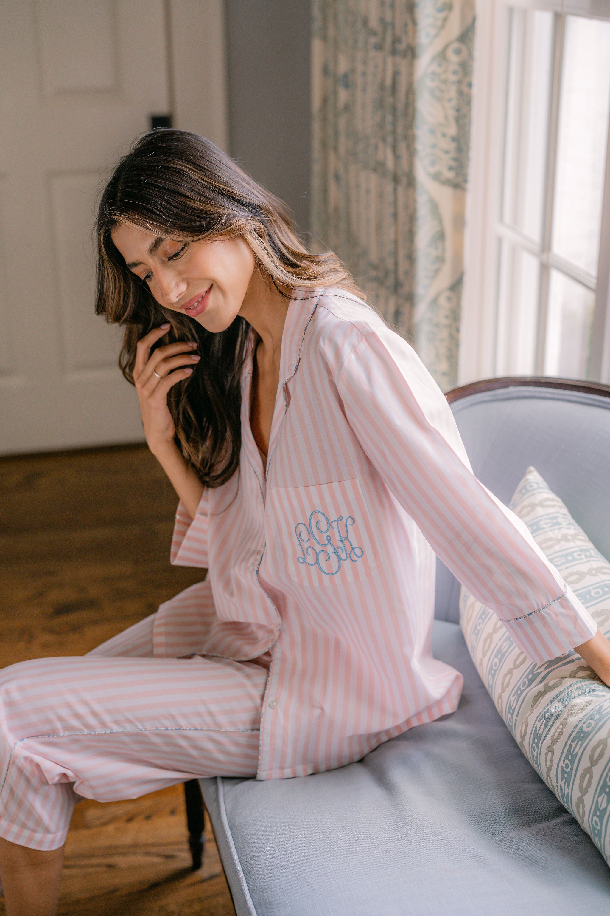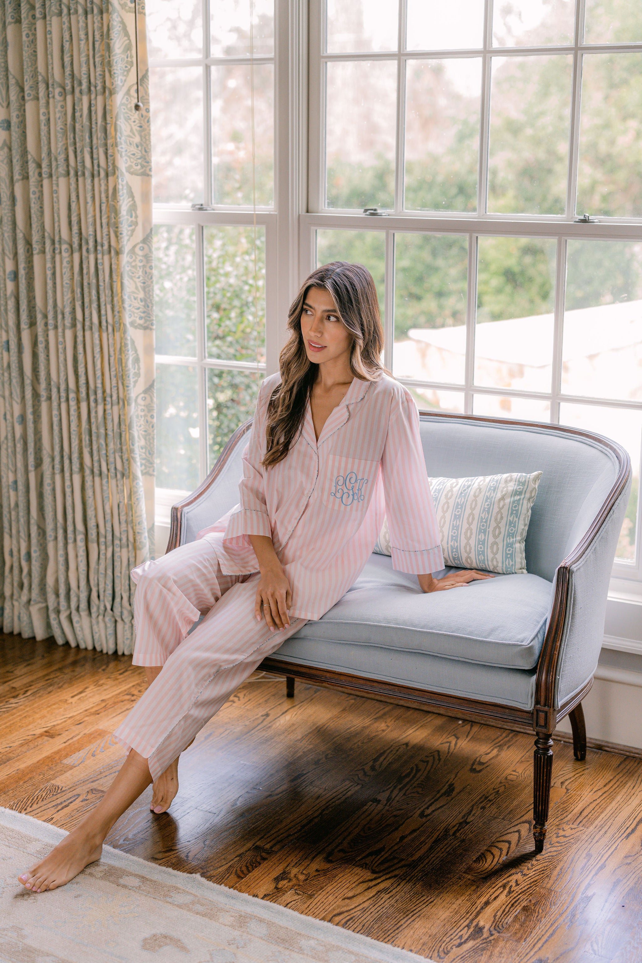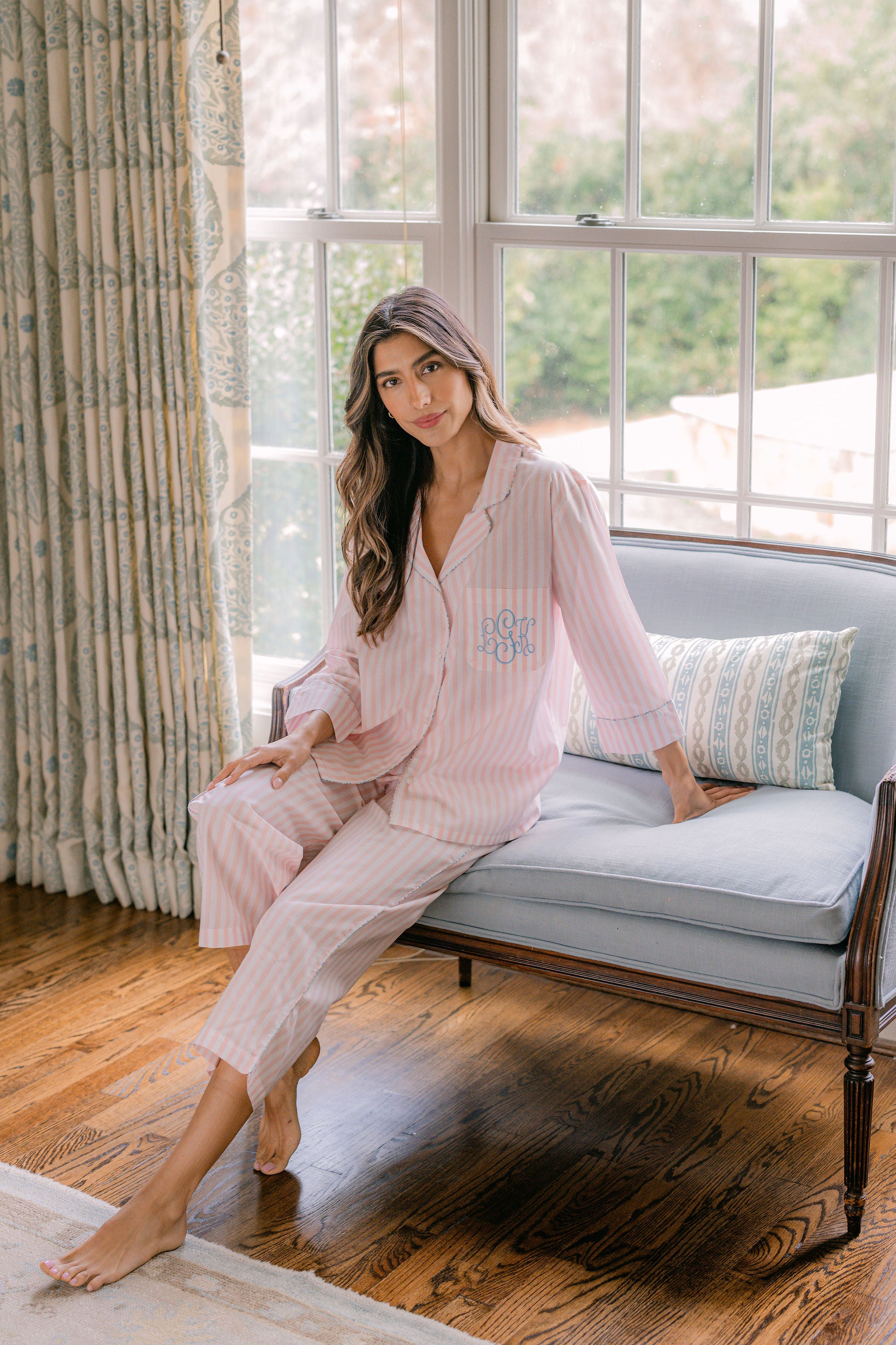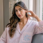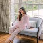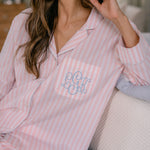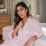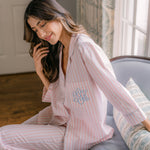 The Classic Capri Pajamas are designed for ultimate comfort and timeless style. Crafted from blended cotton, these pajamas are ultra-lightweight and super soft, perfect for year-round wear. The traditional button-front top features a classic silhouette and ¾-length sleeves. The ankle-length capri pants offer a relaxed fit with an elastic drawstring waist and pockets for added convenience. Offered in white and blue stripe or white with pink stripe, both with a delicate French floral piping.