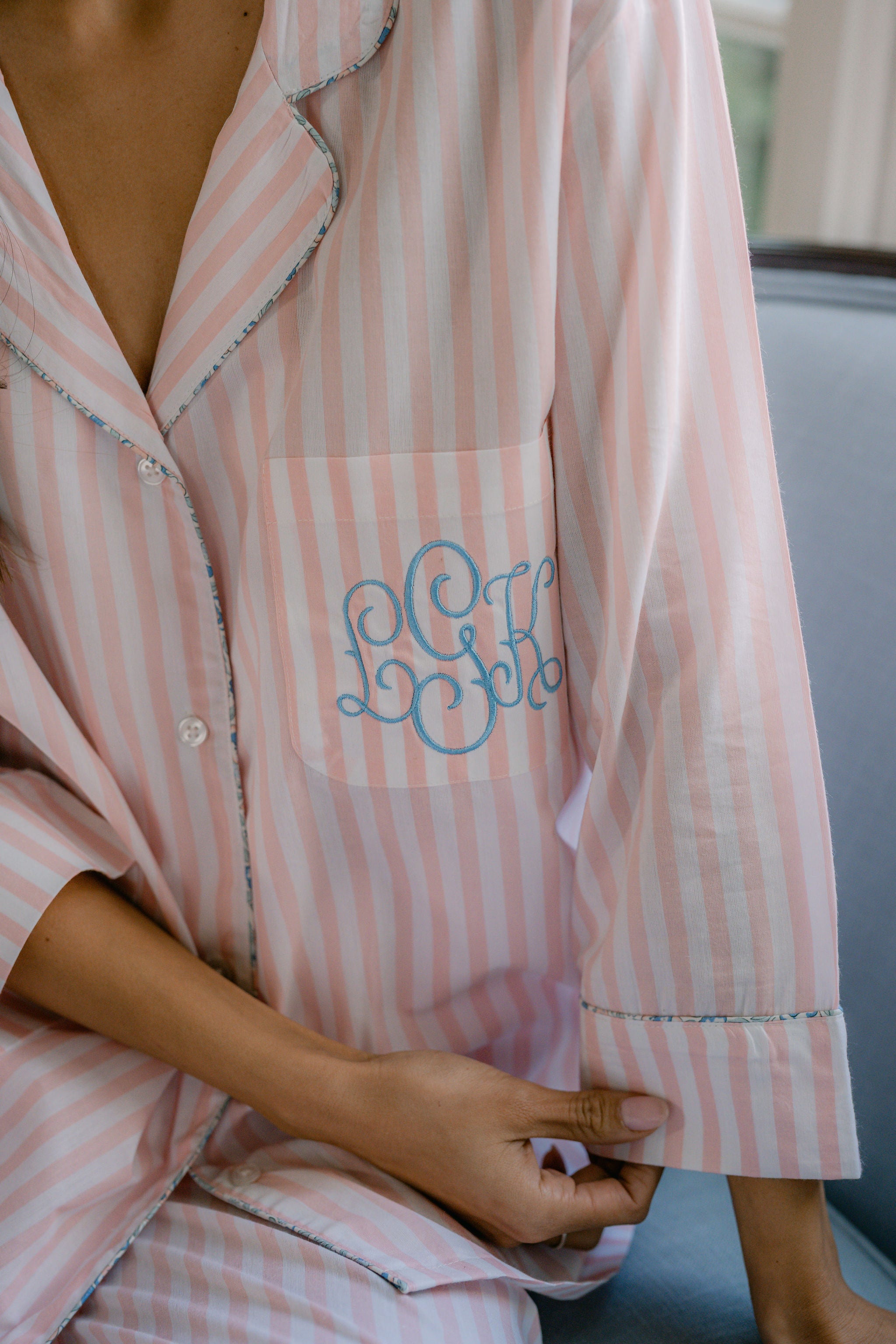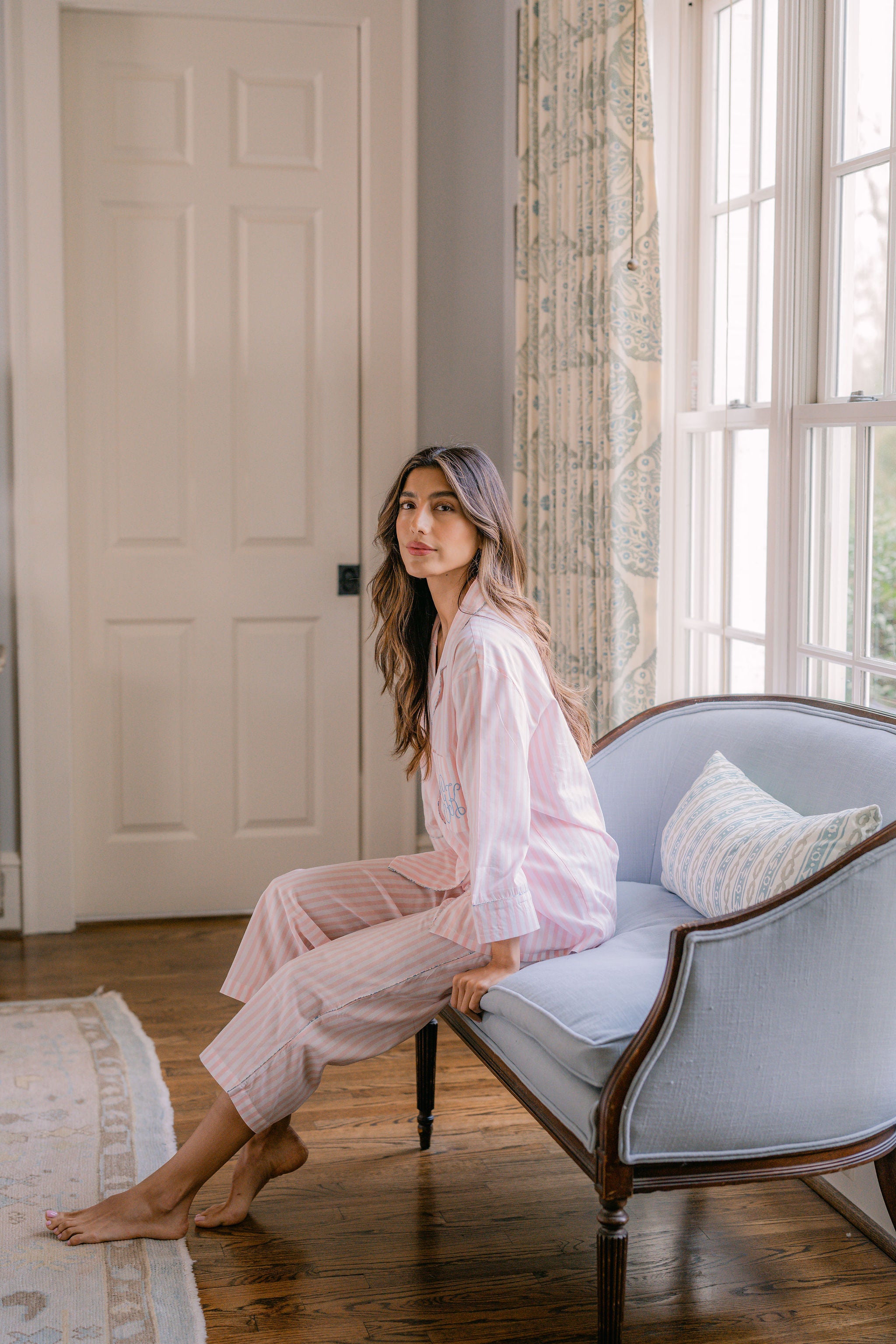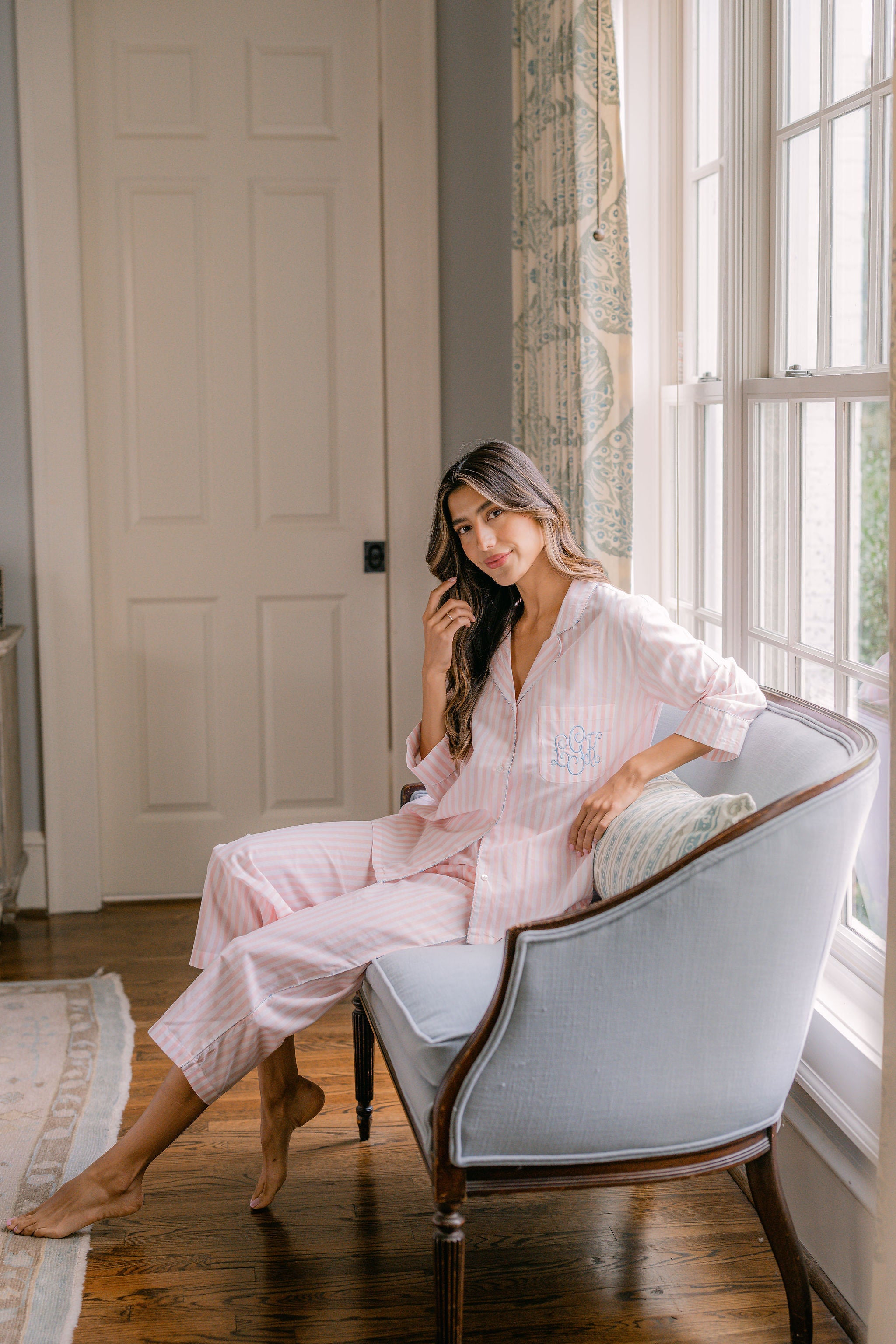 The Classic Capri Pajamas are designed for ultimate comfort and timeless style. Crafted from blended cotton, these pajamas are ultra-lightweight and super soft, perfect for year-round wear. The traditional button-front top features a classic silhouette and ¾-length sleeves. The ankle-length capri pants offer a relaxed fit with an elastic drawstring waist and pockets for added convenience. Offered in white and blue stripe or white with pink stripe, both with a delicate French floral piping.