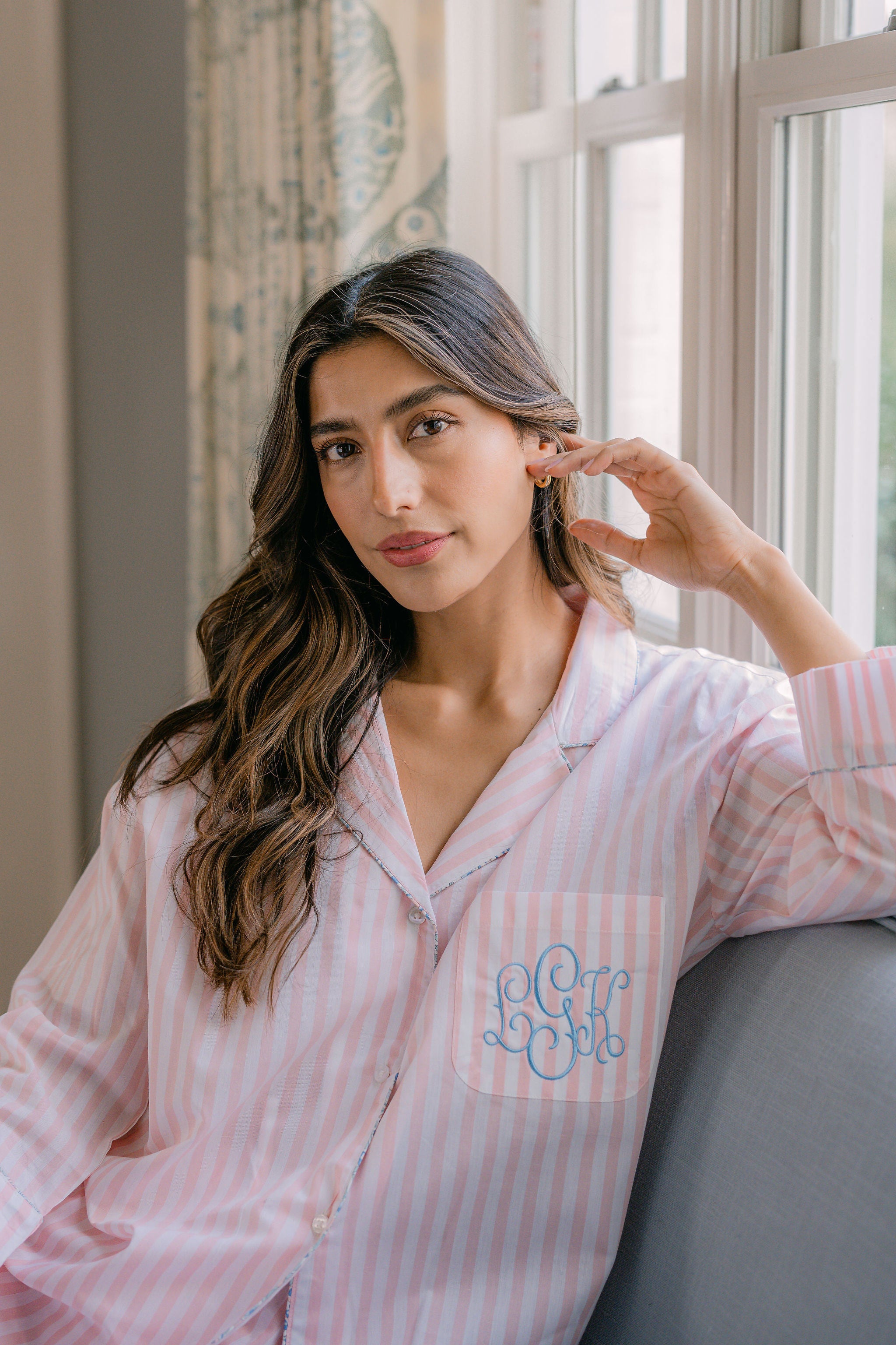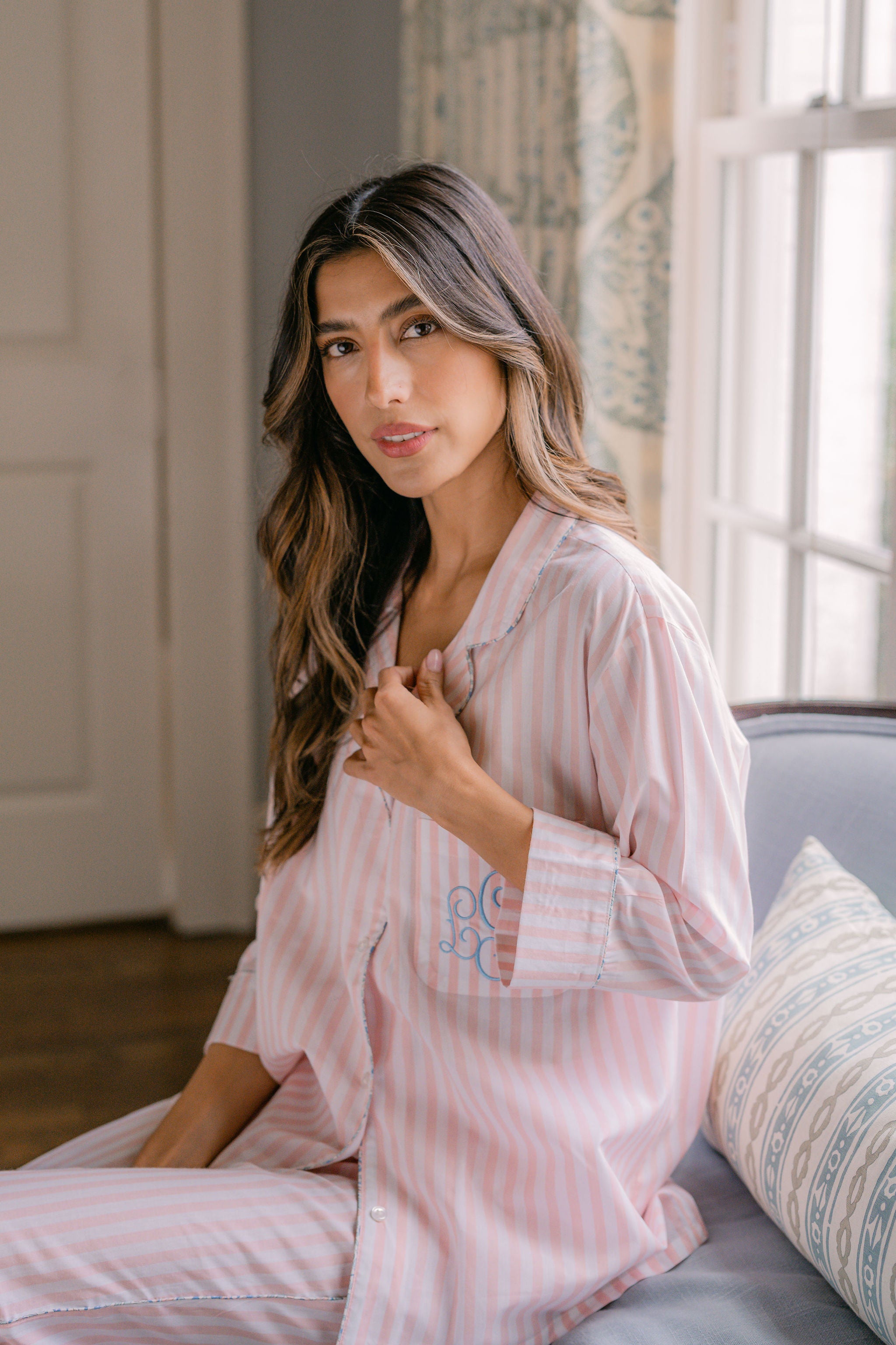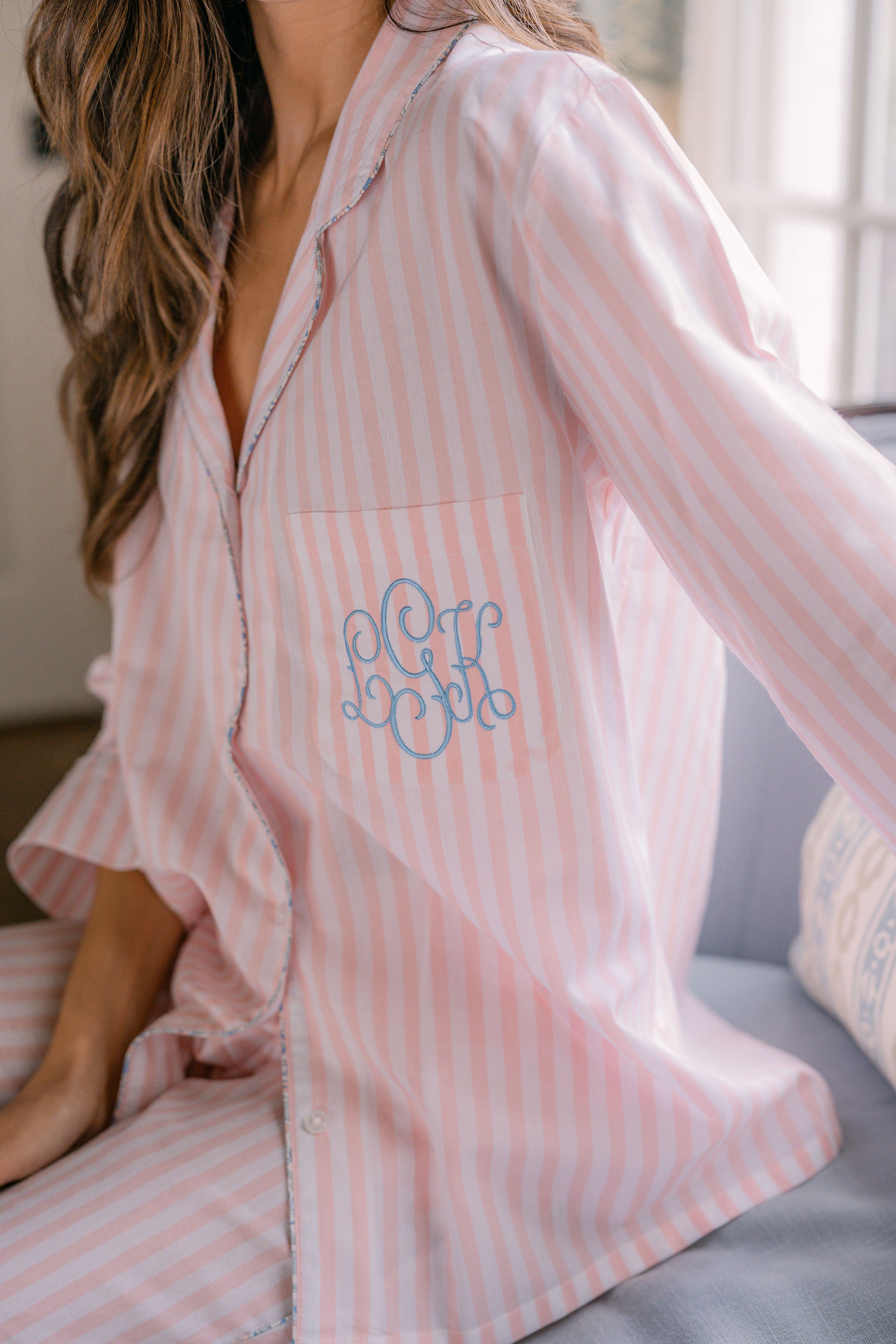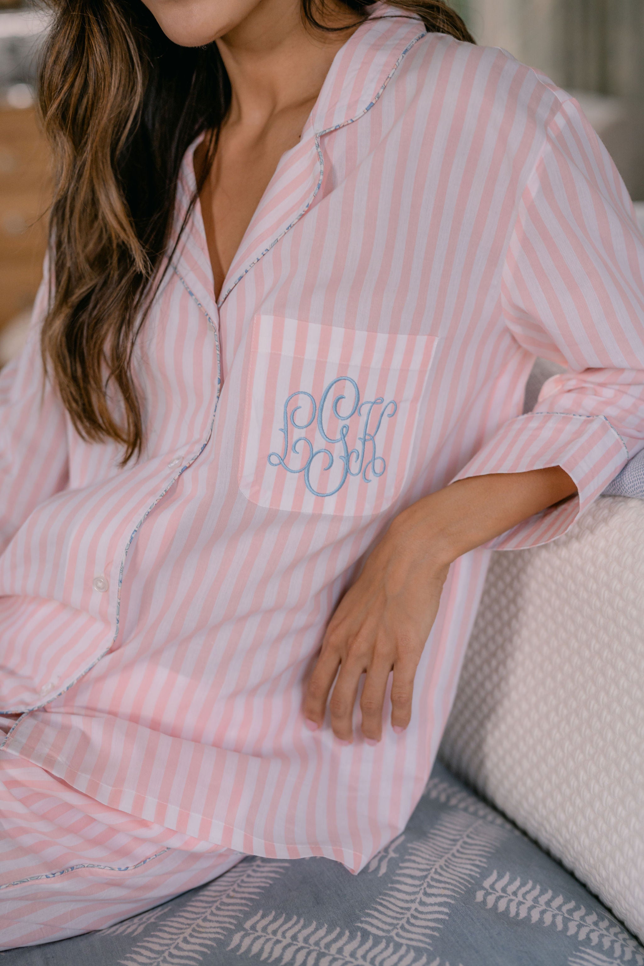 The Classic Capri Pajamas are designed for ultimate comfort and timeless style. Crafted from blended cotton, these pajamas are ultra-lightweight and super soft, perfect for year-round wear. The traditional button-front top features a classic silhouette and ¾-length sleeves. The ankle-length capri pants offer a relaxed fit with an elastic drawstring waist and pockets for added convenience. Offered in white and blue stripe or white with pink stripe, both with a delicate French floral piping.