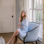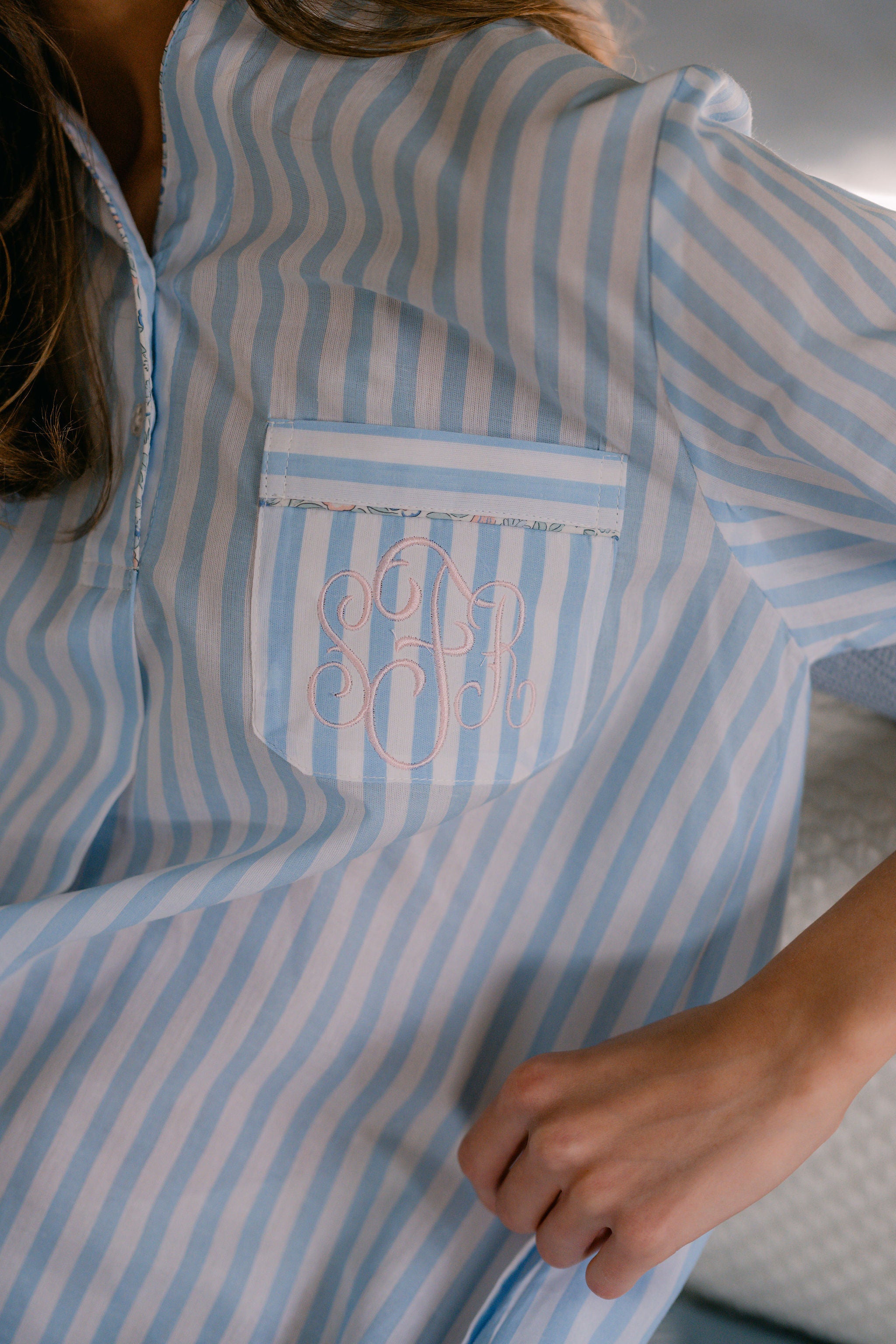 The Classic Stripe Nightshirt is a perfect blend of timeless style and cozy sophistication. Crafted from a breathable cotton blend, this ultra-lightweight nightshirt offers a soft, airy feel. It features elegant French Floral piping for a delicate, feminine touch. The Mandarin collar, two-button front placket, and banded ¾-length sleeves create a tailored yet relaxed silhouette. Thoughtfully designed with pockets for added convenience, this above-the-knee nightshirt is both stylish and practical. Available in blue or pink stripes.