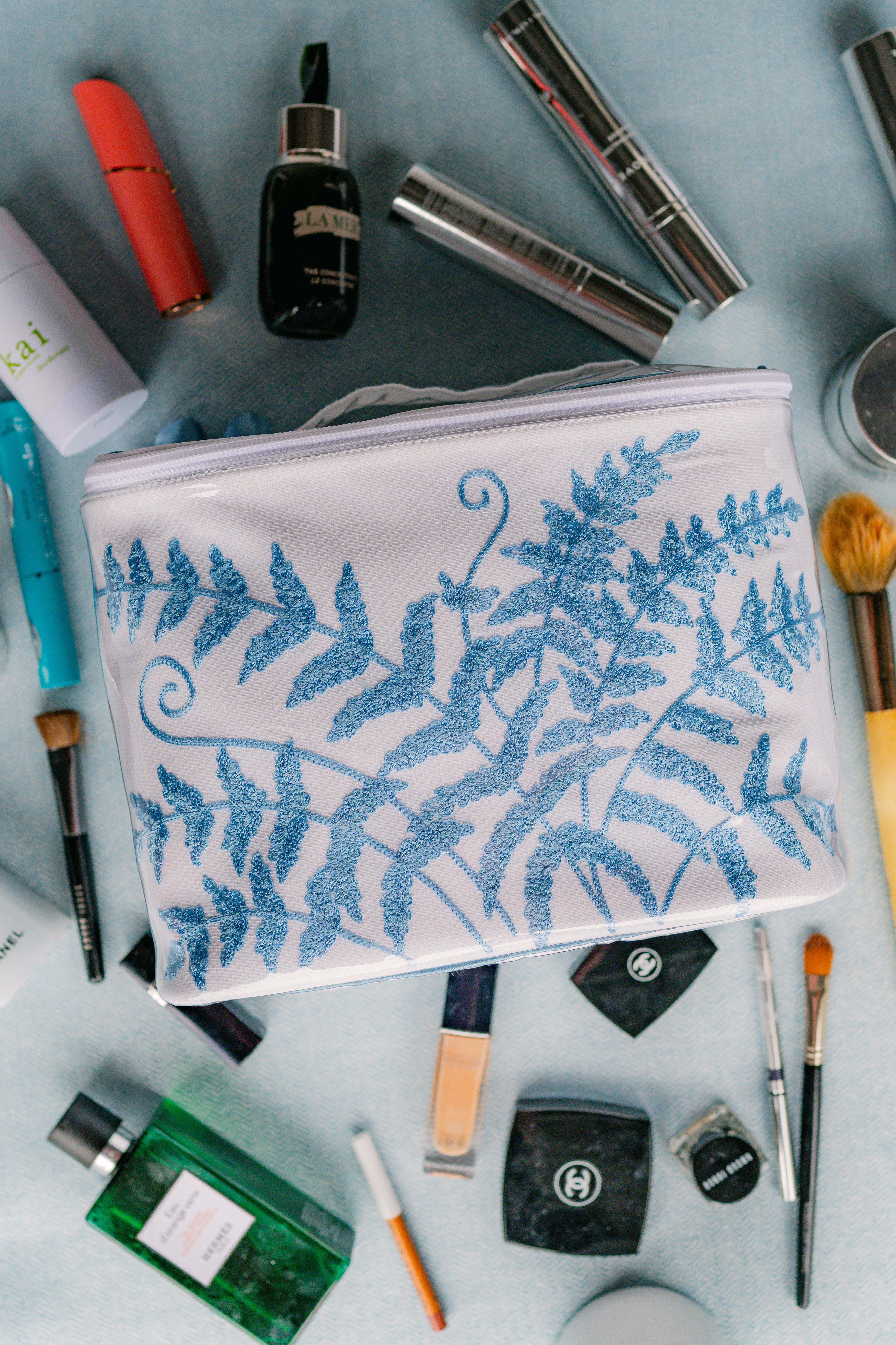 Our Fern Train Case exists at the intersection of beauty and practicality. Beautifully Embroidered with delicate fern leaves, the stylish case features ample storage space and even includes pouches along the sides to safely and securely hold all your make-up, skincare, covered in a plastic material for easy cleaning, and other beauty essentials on your next getaway.